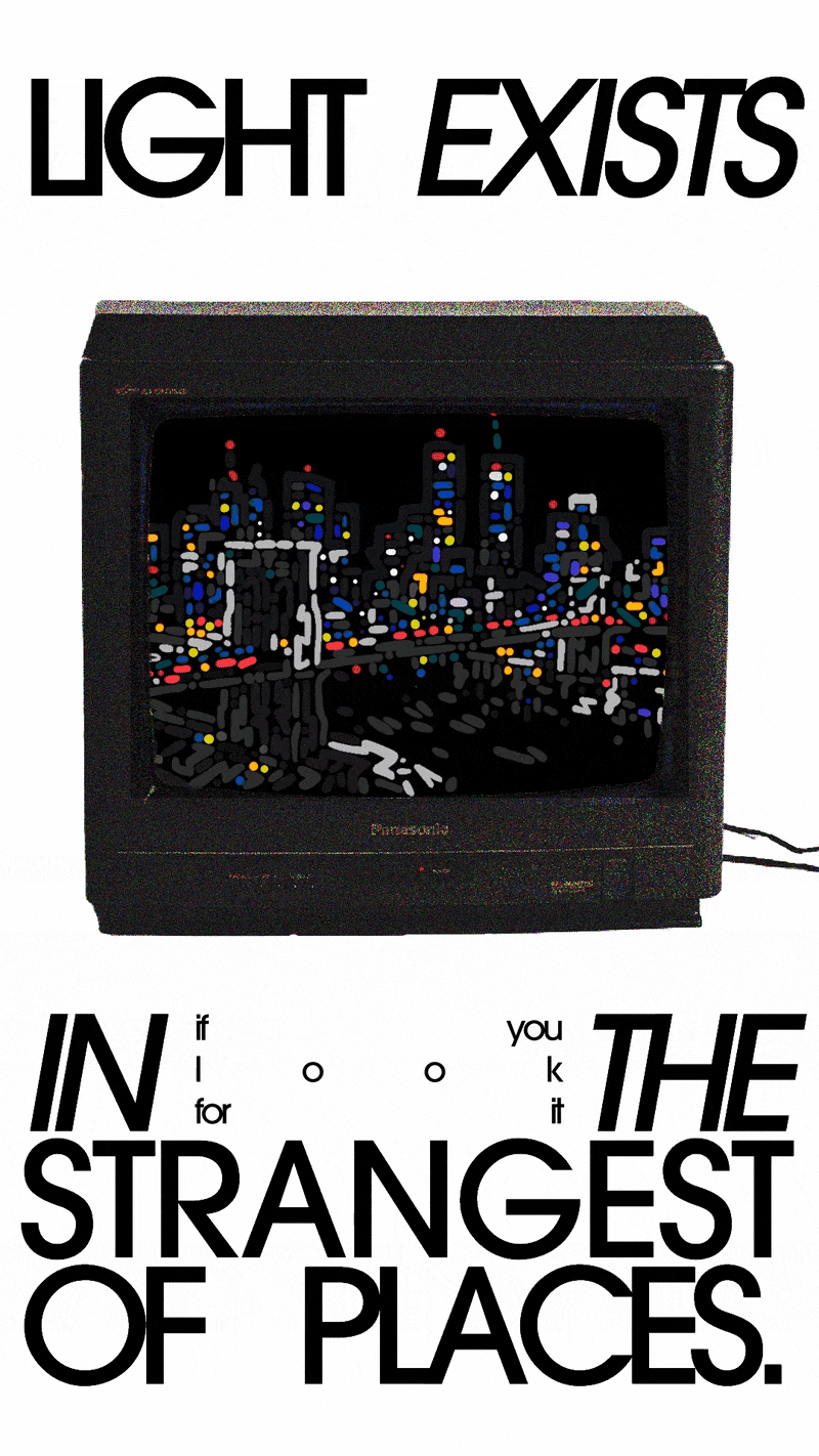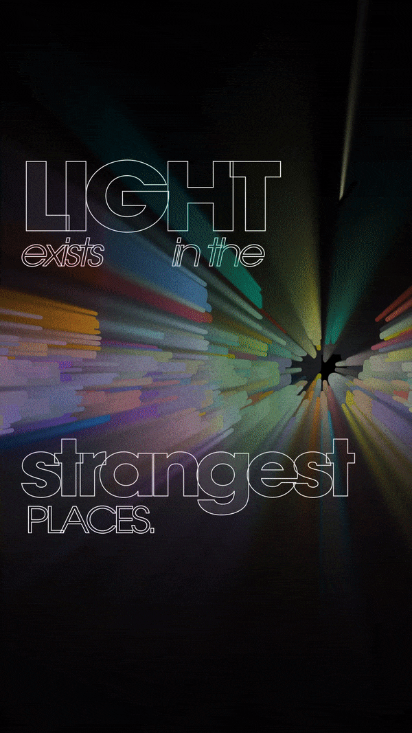 This series of animated posters investigates how “light” as an abstract concept can be harnessed as a dynamic design element to create a kinetic motion within a static frame. Using pointilism, I generated a series of illustrations that have custom keyframed animations to make light itself the primary storyteller. The geometric precision of ITC Avant Garde typeface was chosen to reinforce the retro-futurist style and to compliment the organic moment of the light points as a grounding design element.
