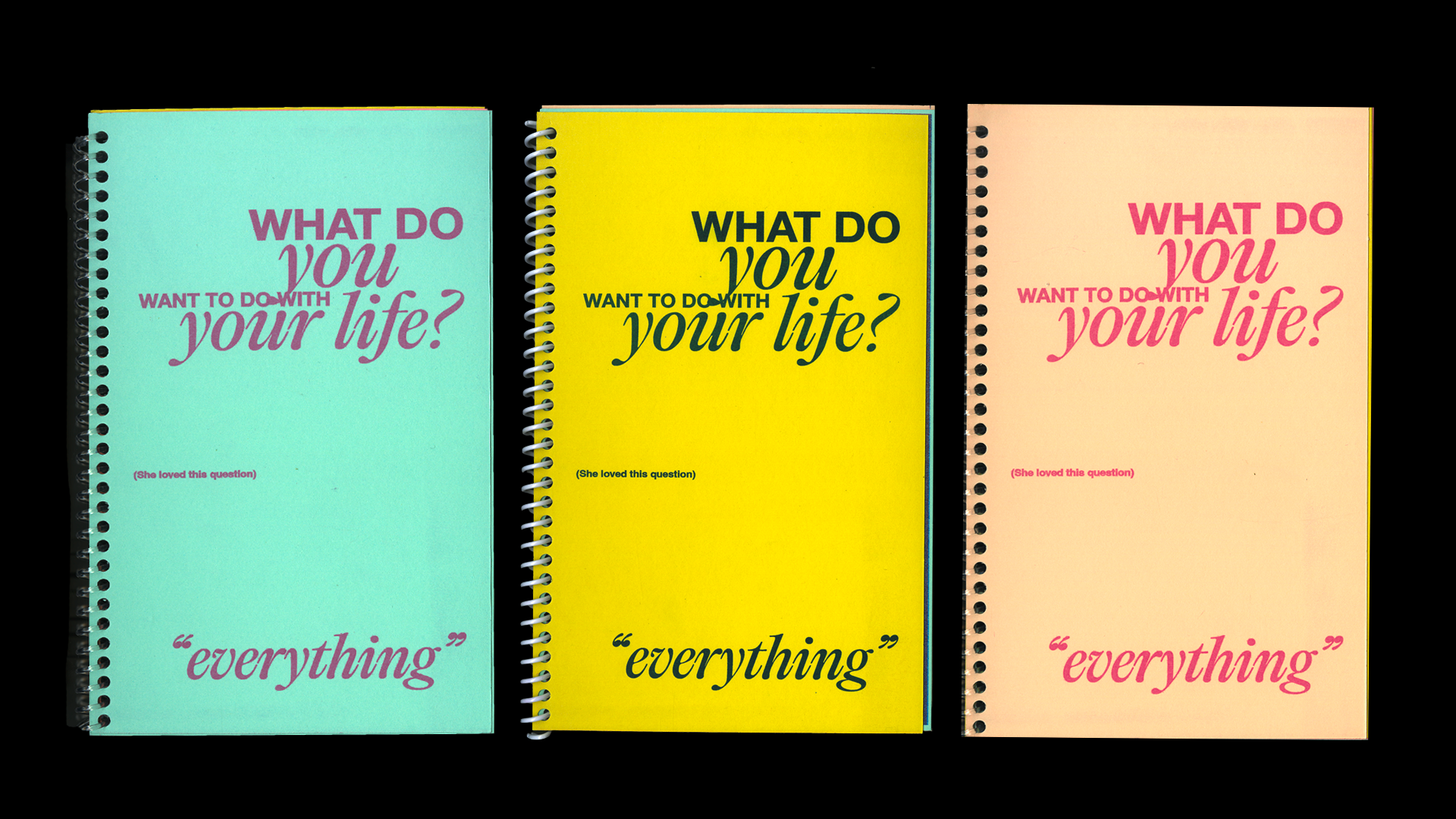 This risograph zine is an abstract response to the question, What do you want to do with your life?—for me, the answer is everything. Printed on Astrobrights paper in a spectrum of colors, each of the 45 spiral-bound editions is unique, with slight variations in layout and palette. Scanographic images of my art supplies—paint tubes, pencils, and brushes—fill the pages in a layered, energetic composition that reflects the chaos and possibility behind the question. The title uses Creato Display and Editorial Old typefaces from Panagram Panagram.